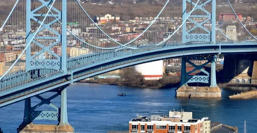 eine kombinierte Straße-Schiene-Hängebrücke über den Delaware River. Die Benjamin-Franklin-Brücke in Philadelphia, ein beeindruckendes Symbol amerikanischer Ingenieurskunst, ist ein beliebter Drehort aufgrund ihrer markanten Architektur und der Panoramablicke auf die Stadt. Die ikonische Hängebrücke über den Delaware River bietet eine visuell beeindruckende Kulisse für energiegeladene Actionsequenzen, dramatische Momente oder ruhige Stadtbilder. Ihre Größe und die Kombination aus städtischen und Flusselementen machen sie zu einer attraktiven Wahl für verschiedene Filmgenres. Interessante Tatsache: Eröffnet im Jahr 1926, verbindet die Brücke Philadelphia mit New Jersey und symbolisiert eine historische Verbindung zwischen den beiden Staaten.